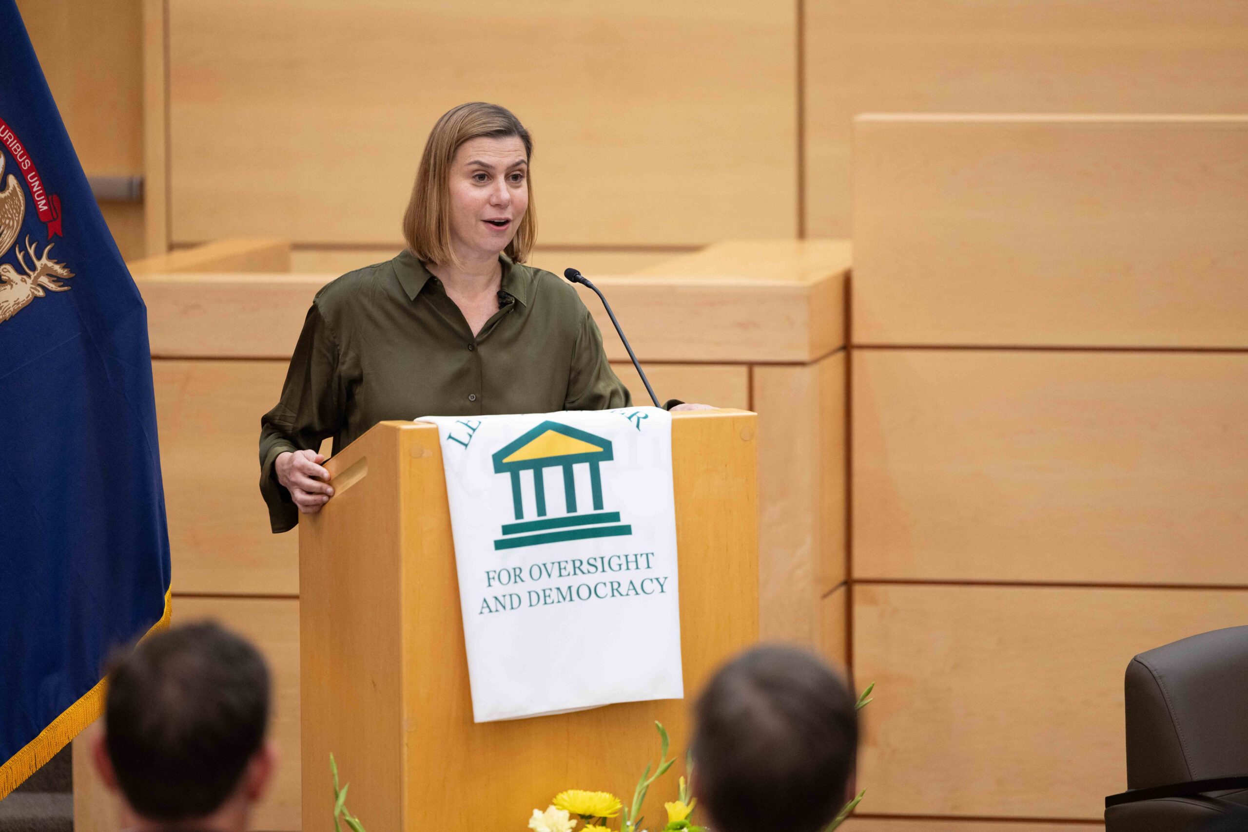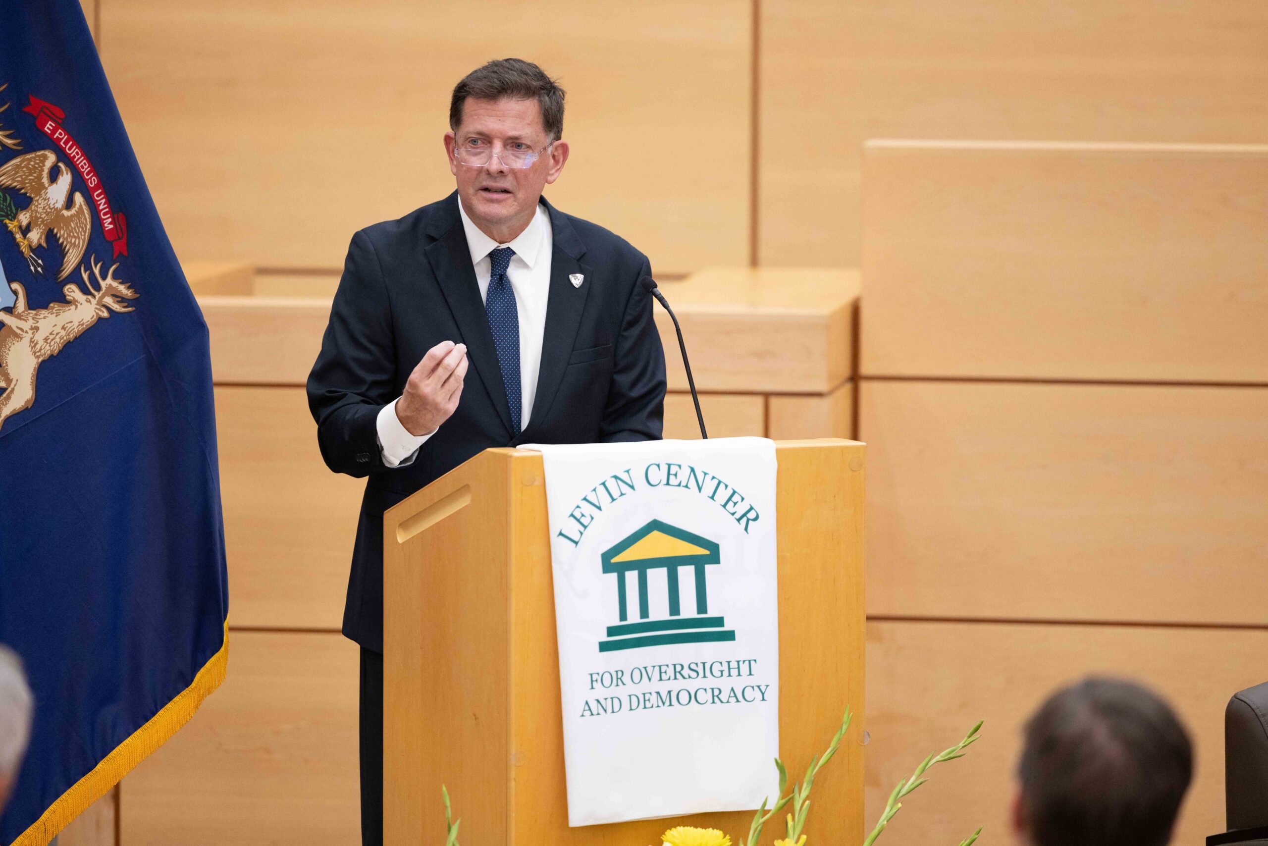 The evening’s keynote was delivered by U.S. Senator Elissa Slotkin, who spoke to her understanding of oversight as a patriotic duty and a cornerstone of democracy. “Questioning power is not some sort of deficit. It is actually patriotism. It makes our policies stronger and more durable,” she said. Slotkin called on leaders to carry forward Carl Levin’s legacy by reasserting Congress’ Article I powers and defending democratic institutions.